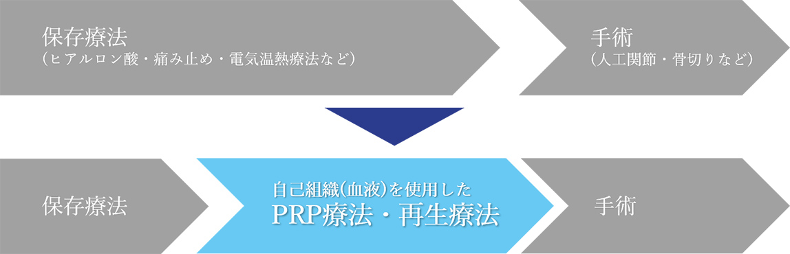 PRP療法・再生療法は、保存療法と手術療法の中間に位置する新しい治療です。当院では、事前に十分にご説明し、ご納得いただいてから治療へと進みます。どうぞ、安心してご相談ください。